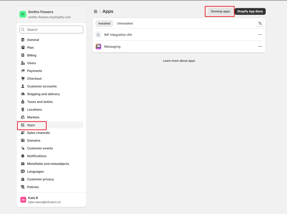 Log in to Shopify and Create a new Shopify App, if you have multiple stores created select the store that you wish to set up with Infusion and follow the below steps